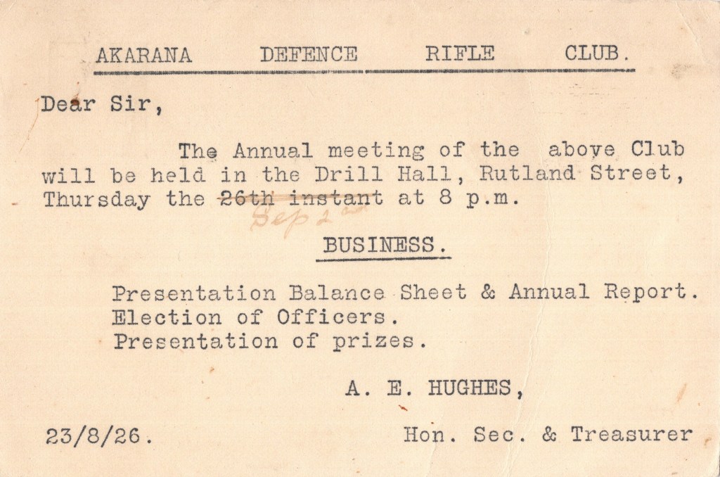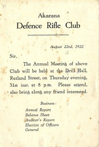 Starting as the Akarana Rifle club it was re-organised into a defence club in 1909. This allowed the club to admit new members and to train at Government ranges, though it meant that members also had to take part in drills and parades.