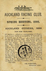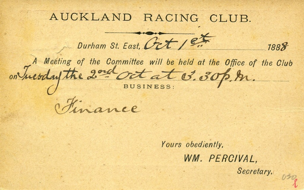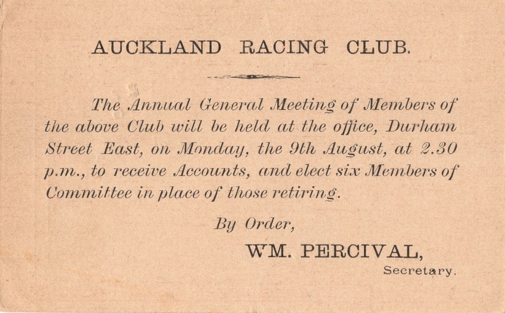 Notes: Card printed for the Auckland Agricultural and Pastoral Association and reused for Auckland Racing Club.