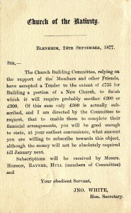 The Anglican parish of Blenheim was first established in 1857 and the first church building, constructed of wood, was built in 1861. A new larger wooden church was opened in 1879. The card was printed to seek subscriptions for this new church.