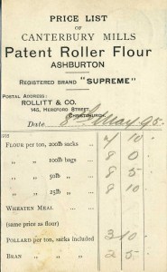 The Canterbury Mills were erected at Wakanui, to the east of Ashburton in an area renowned for wheat growing, by Mr. Moffat during the early years of settlement in Canterbury. The mills were acquired by Mr. Thomas Rollitt in the early 1880’s. The mills were then operated under the Rollitt & Co name.