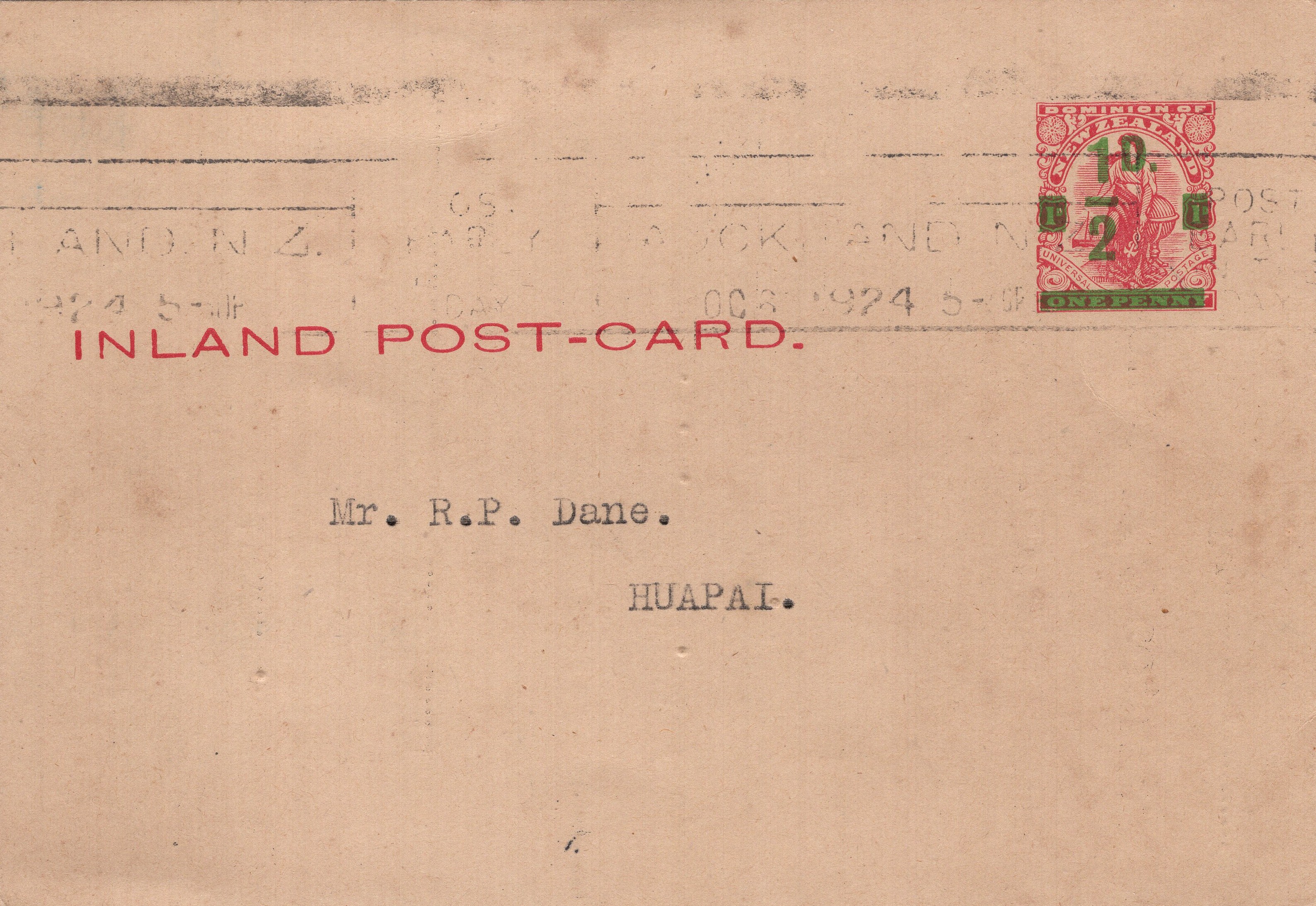 Card: KGV ½d Green on 1d Carmine (Samuel AC.8a)
