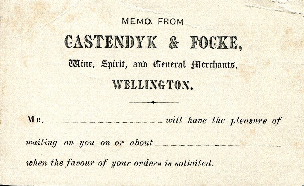 Castendyk & Focke were a wine, spirit and general merchants located at 3-5 Featherston Street, Wellington.