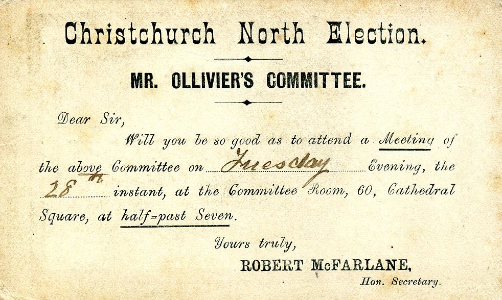 John Ollivier was born on the Isle of Wight in 1812 and arrived in New Zealand in 1853. He was involved in both local and provincial politics and in 1889, following the resignation of Sir Julius Vogel, he ran for the Christchurch North seat. He was narrowly beaten by Edward Humphreys.