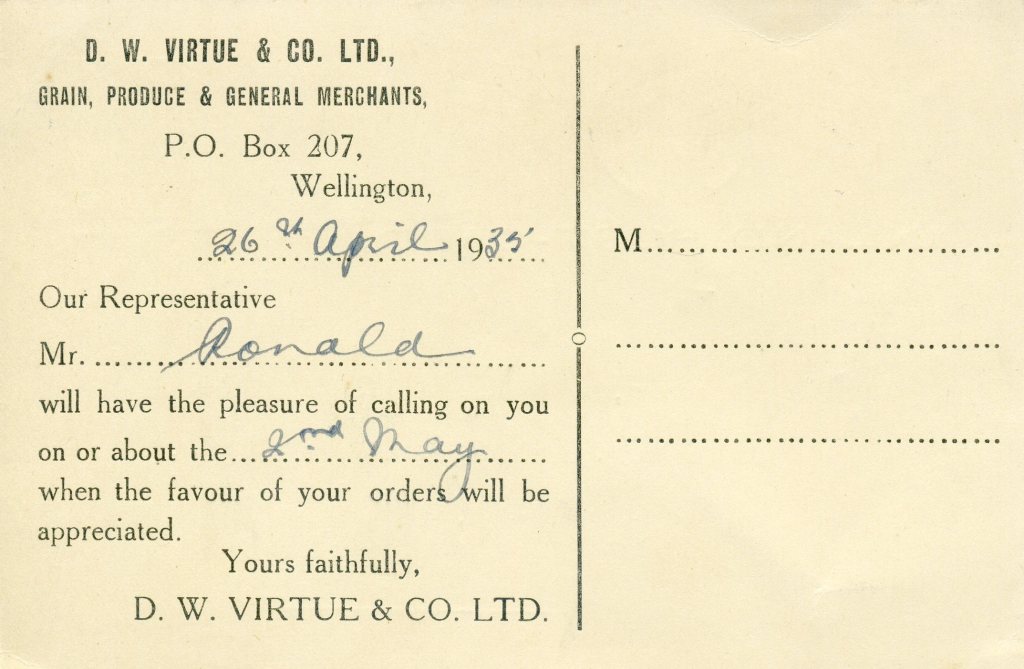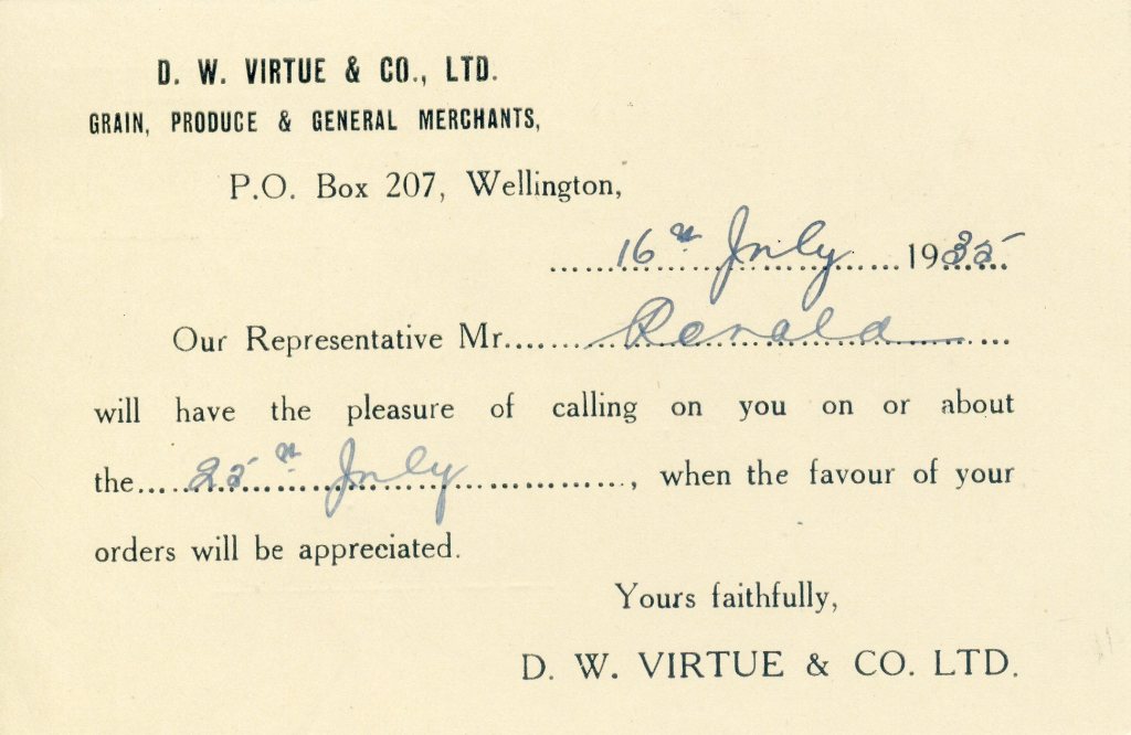 D. W. Virtue was a produce and general merchants in Wellington. In the mid-20th century the business would eventually be absorbed by Wright Stephenson & Co.