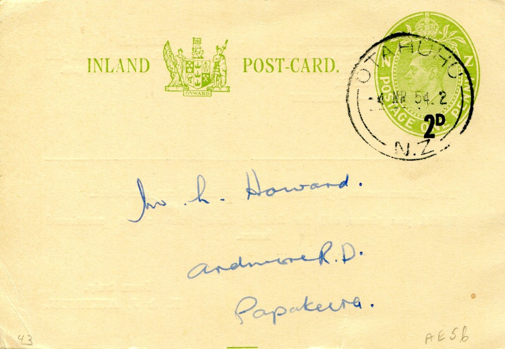 Card: KGVI 2d on 1d Yellow-green (Samuel: AE.5b)