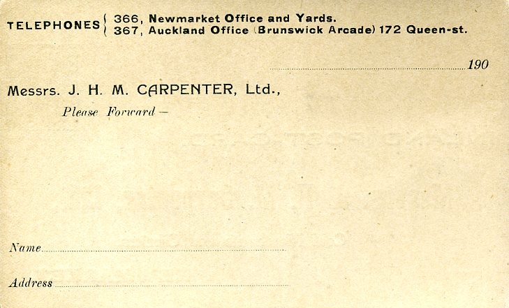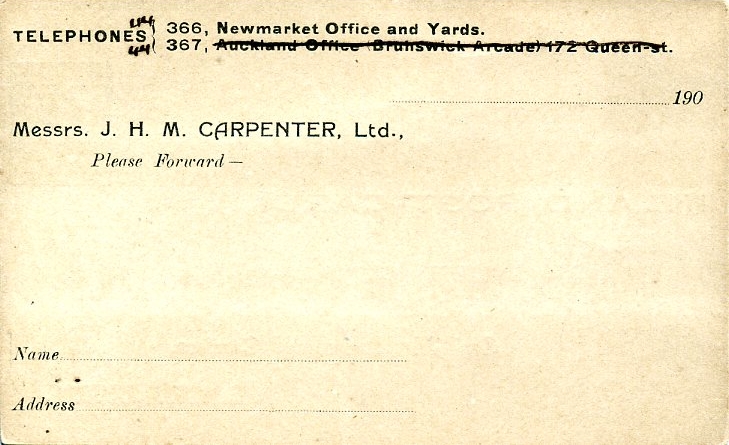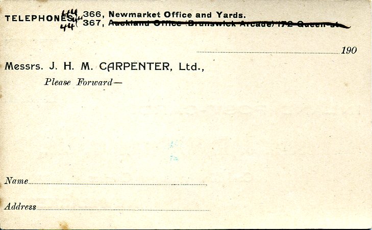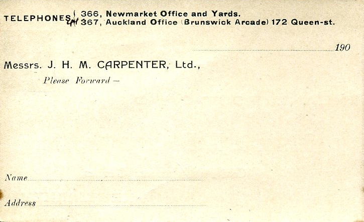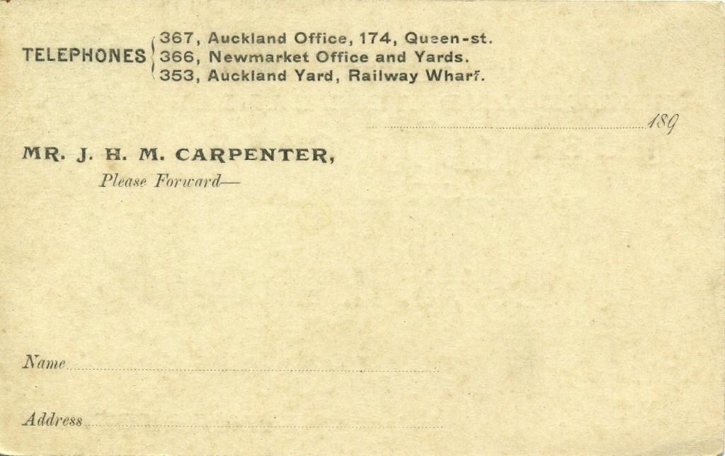 J.H.M. Carpenter was born in England in 1838 and the family emigrated to New Zealand when he was still very young. The family settled in Panmure, Auckland and by 1884 he had established his coal merchants business.