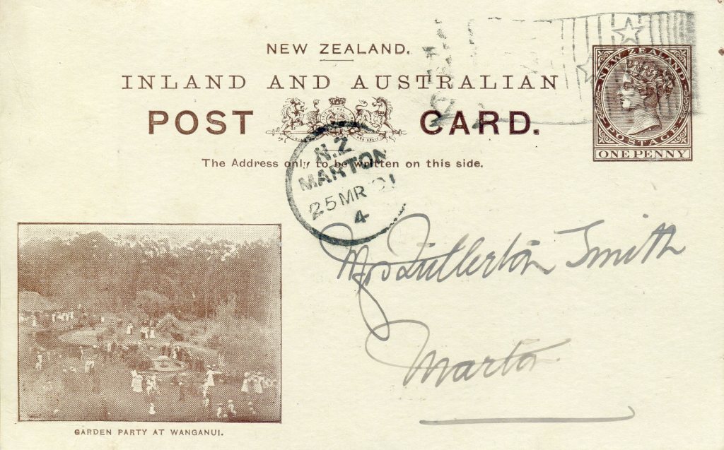 Card: QV 1d Brown – Garden Party at Wanganui (Samuel: AA.10b(o))