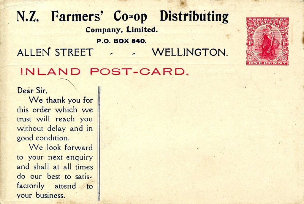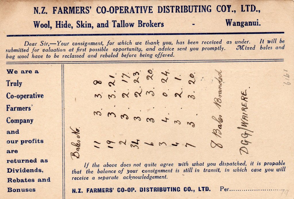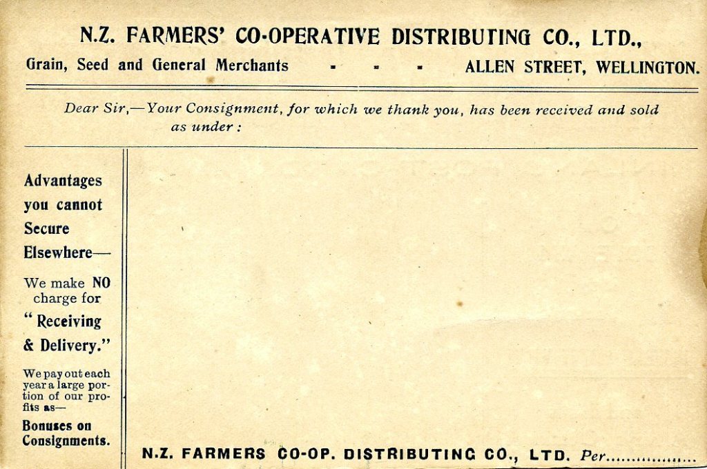 The Co-operative was formed by 900 farmers in the Wellington, Nelson and Marlborough districts with a view of obtaining higher market values for goods sold and to supply farm equipment, grain, etc. to farms at lower prices.