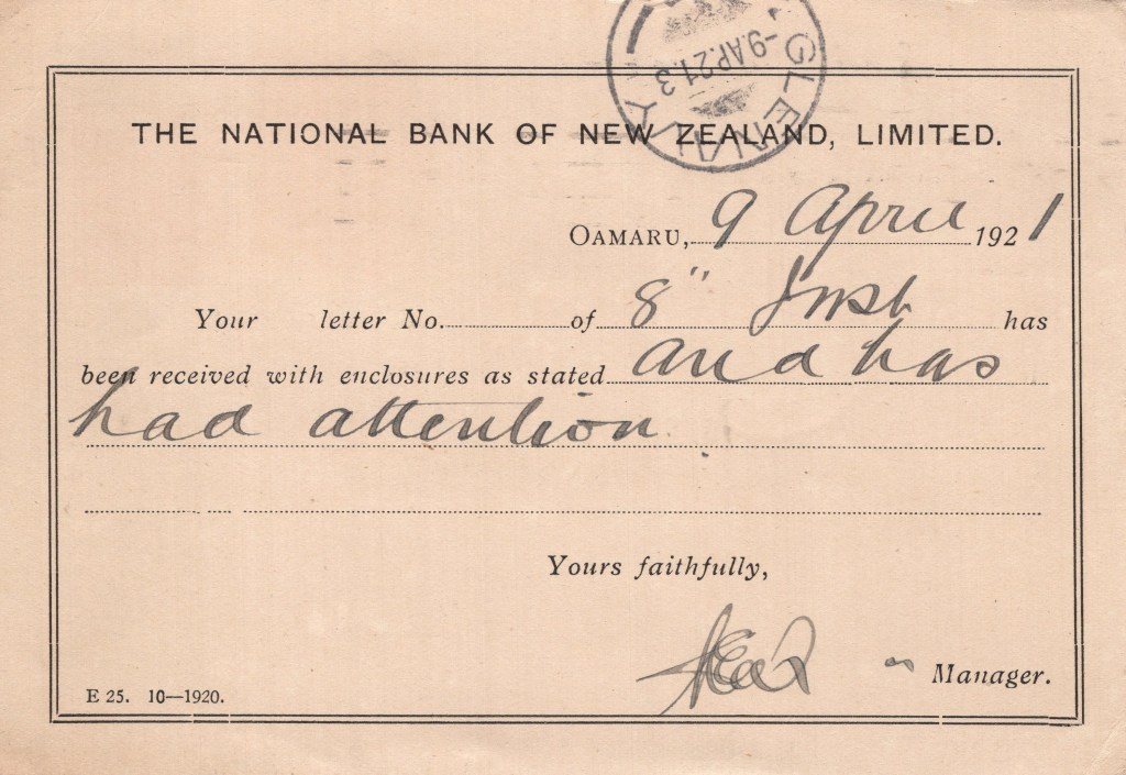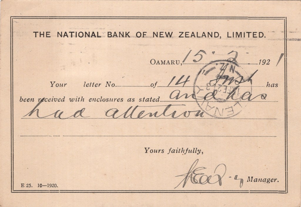 Notes: Printing Number: E25 10-1920 – OAMARU Branch