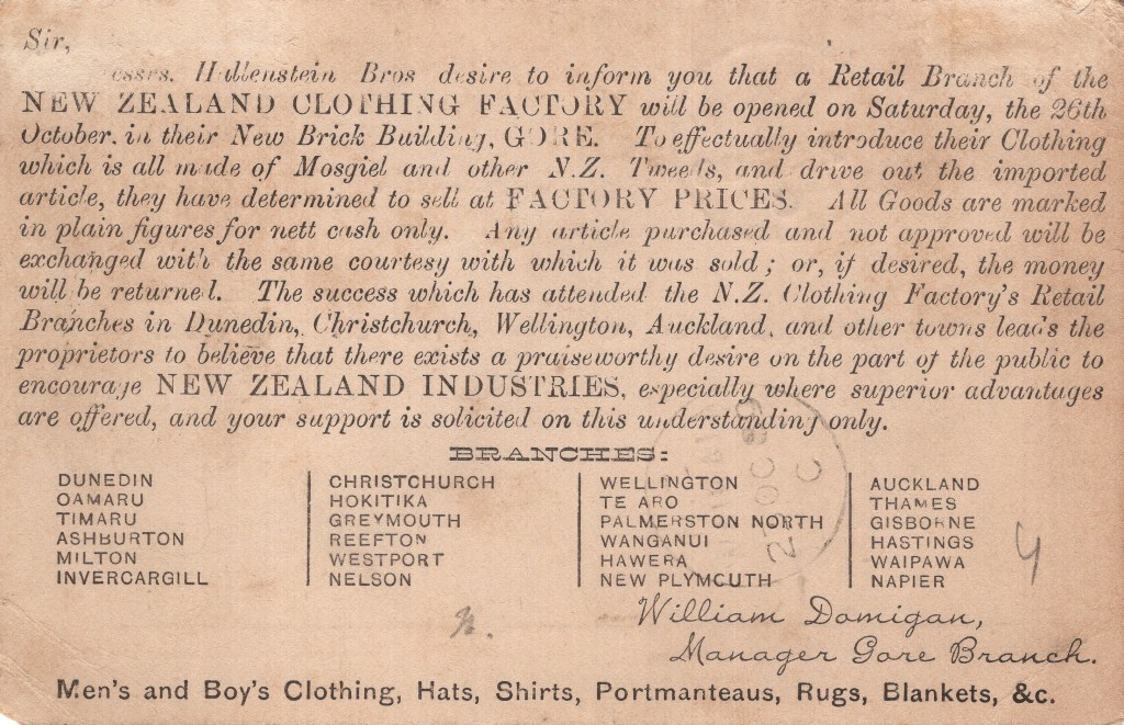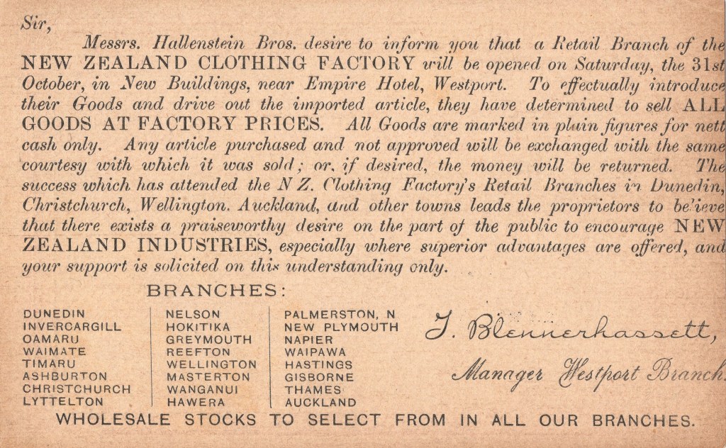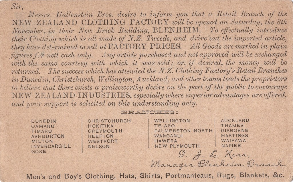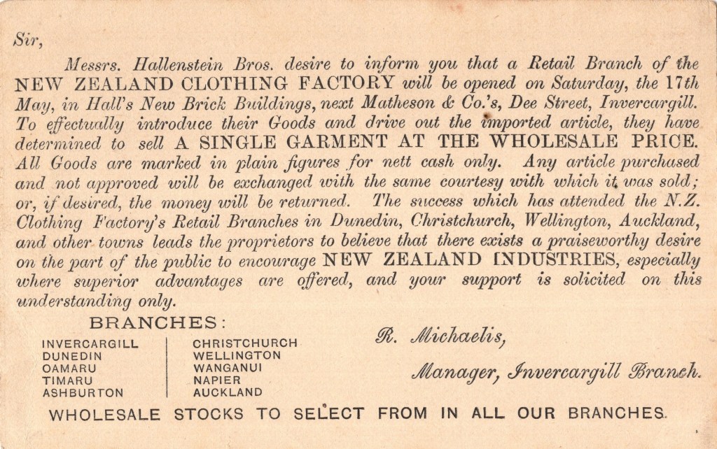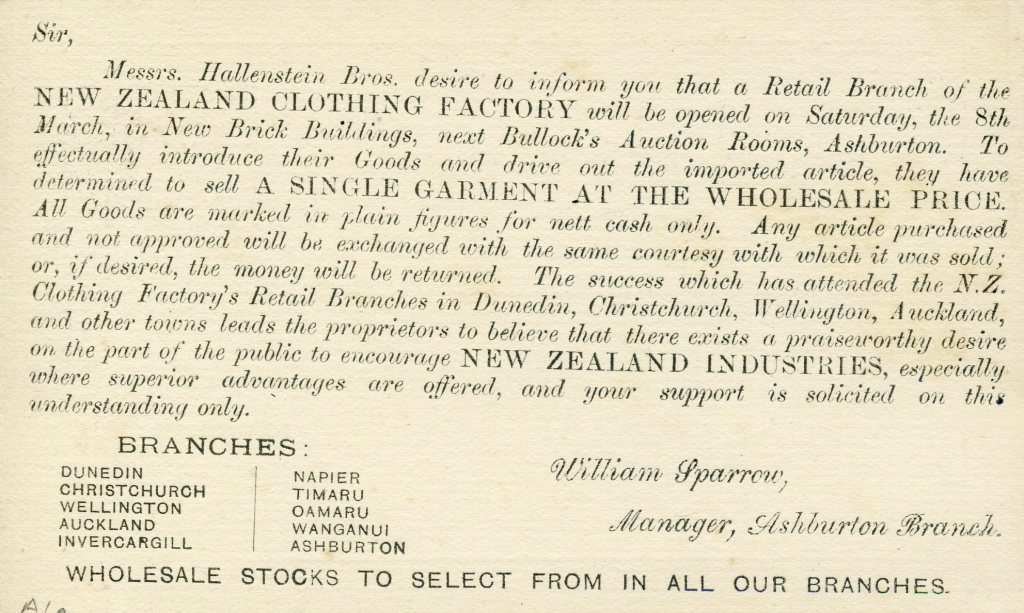 Hallenstein Brothers opened the New Zealand Clothing Factory in Dunedin in 1873 following problems in acquiring garments for their stores. This was the first clothing factory in New Zealand and supplied not only Hallenstein Brothers and Bendix Hallenstein’s D.I.C. department store chain but many other New Zealand stores.