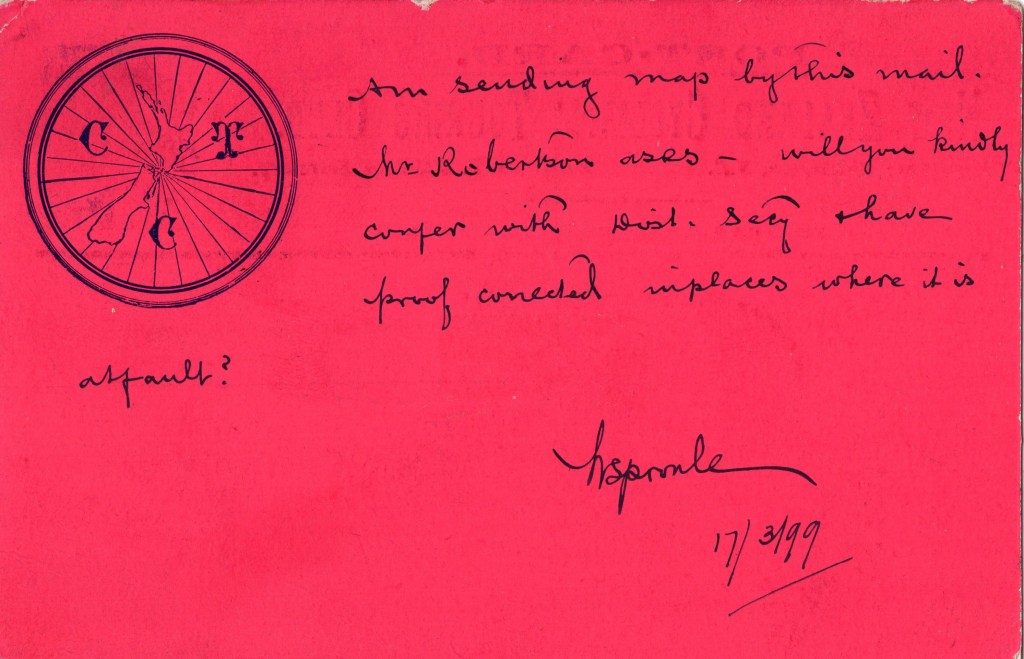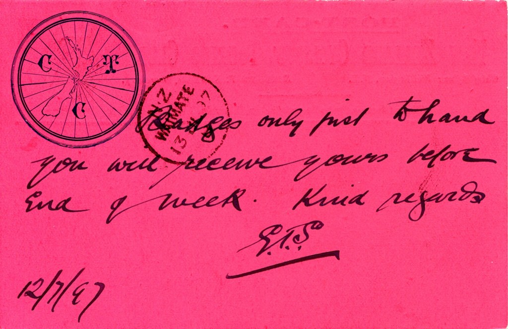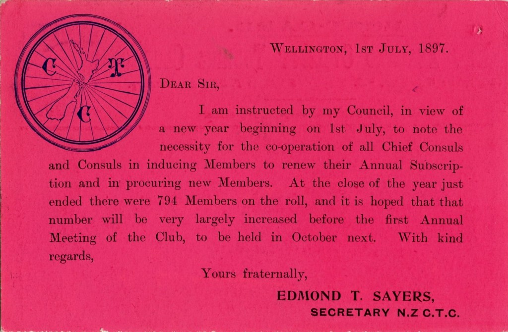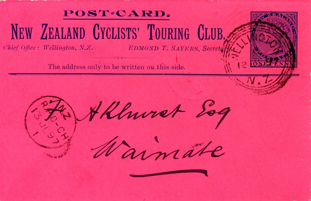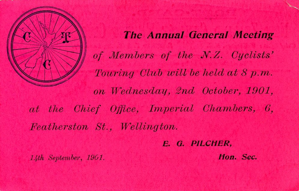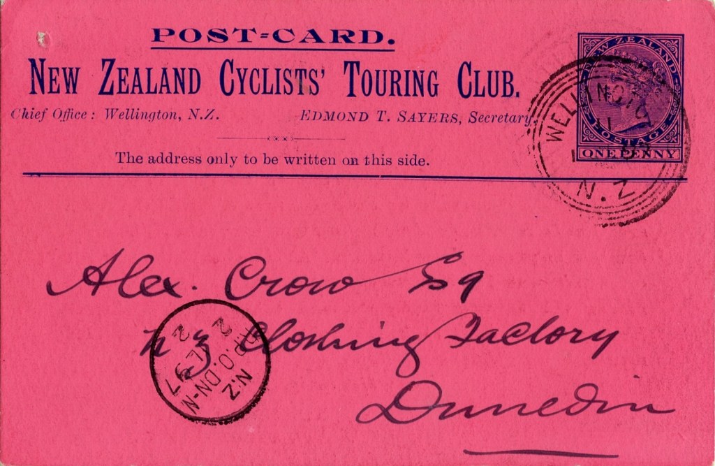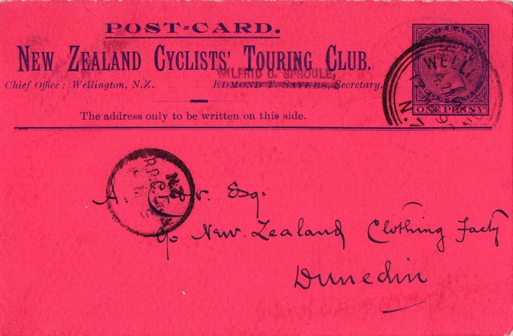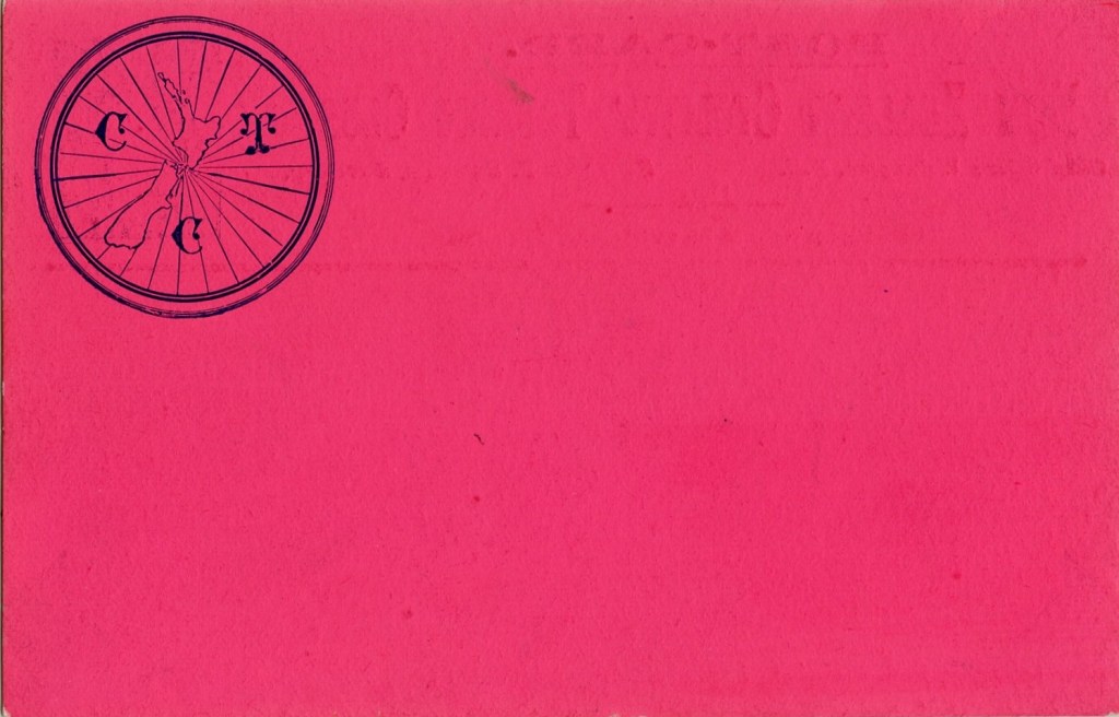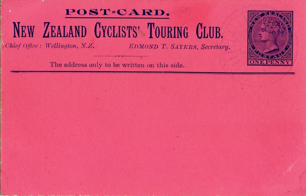 The New Zealand Cyclists Touring Club was established to provide help and services to cyclists making long journeys throughout the country. Originally printed in 1897 the surplus cards were further printed on the reverse in 1901 with a notice about the AGM.