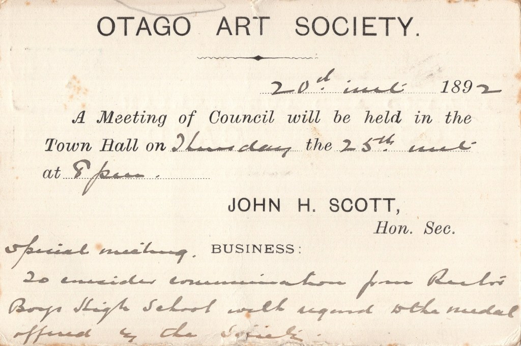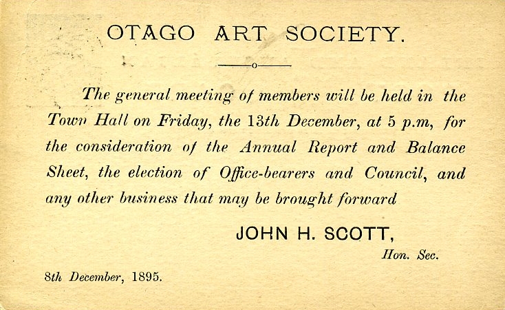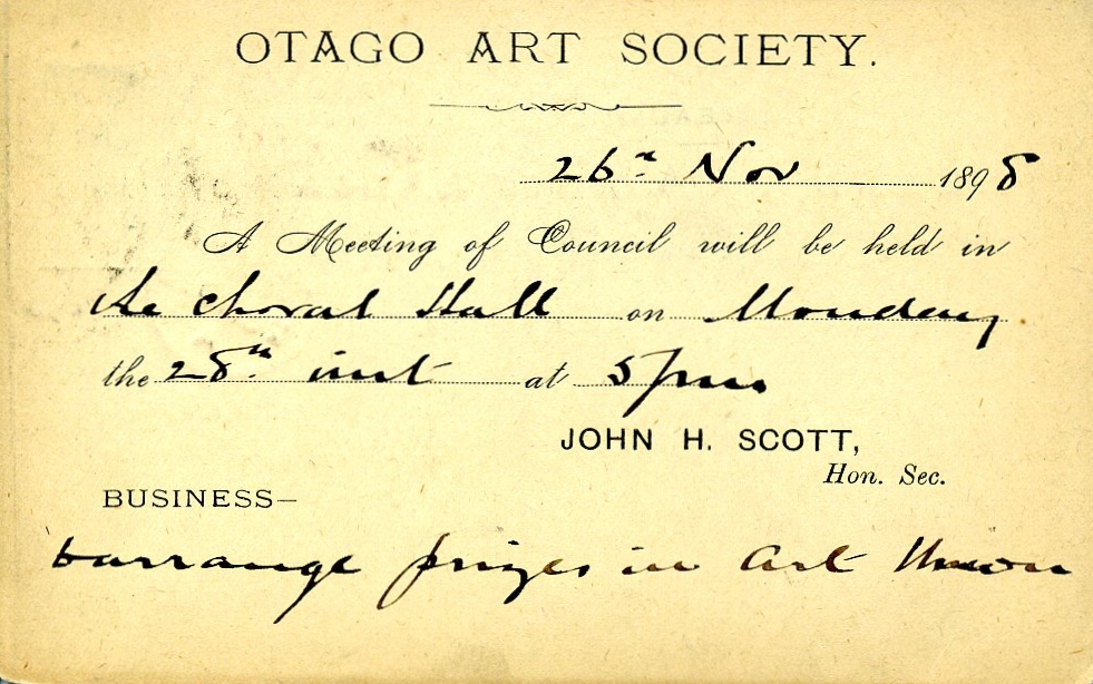 The Otago Art Society was established in 1876 with the aim of promoting interest, the study and the practise of fine and applied arts in Otago. The society is still going strong and since 2007 has been housed at the Dunedin Railway Station building on Anzac Avenue, Dunedin.