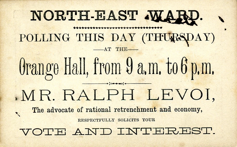 According to the Lyttelton Times of 13 September 1889 this was Ralph Levoi’s third attempt at being elected to Christchurch City Council. He did not succeed on this occasion, only managing to attract 89 votes. The winner, James Rowe, was elected with 488 votes. Despite this, it is recorded that he was eventually elected to the council in April 1894 following the retirement of H.B. Vogel, but failed to be re-elected in the election of September of the same year.