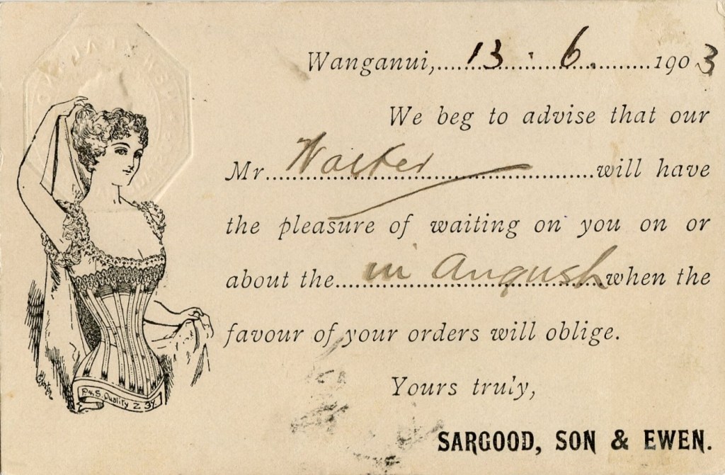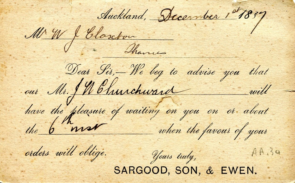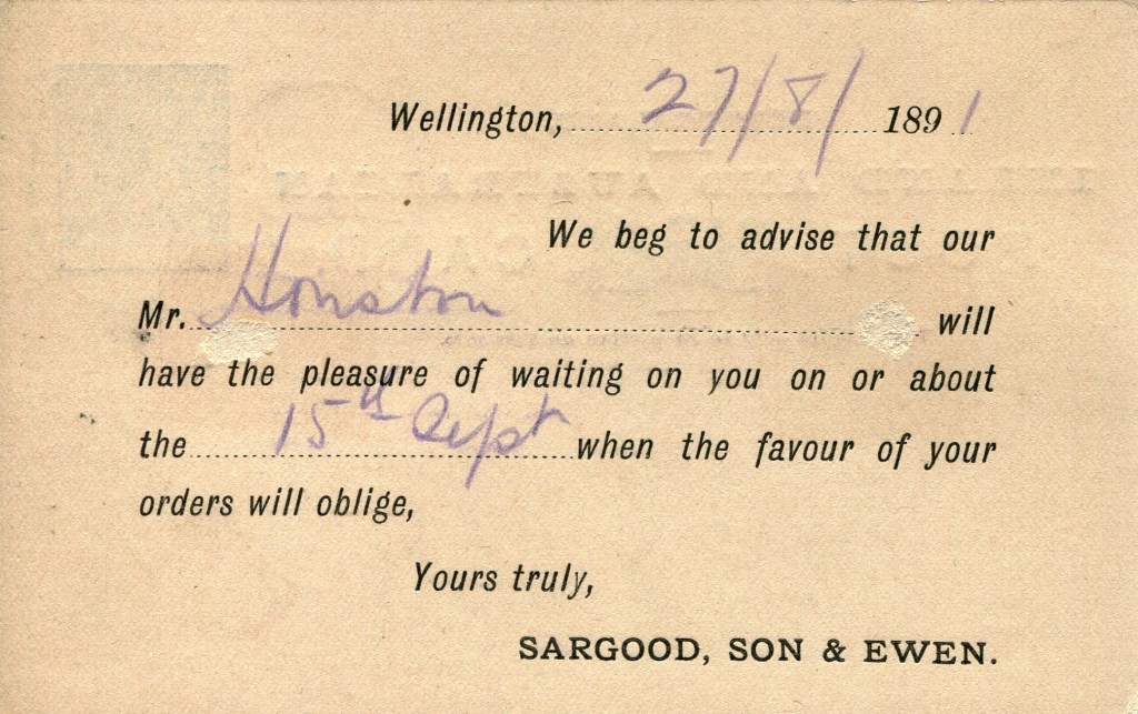 The firm of Sargood, So & Ewen was established in Melbourne, Australia in 1848 by Mr Frederick James Sargood as an import business. Mr John Alexander Ewen joined the business in the early 1850’s and premises were opened throughout New South Wales and South Australia. The firm was later joined by F. J. Sargood’s son, Sir Frederick Thomas Sargood. The first New Zealand branch was opened in Dunedin in 1863 and was primarily involved in drapery and clothing; though they also had departments for stationery fancy goods, chemists, tobacconists and leather goods.