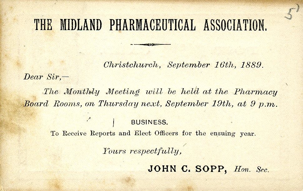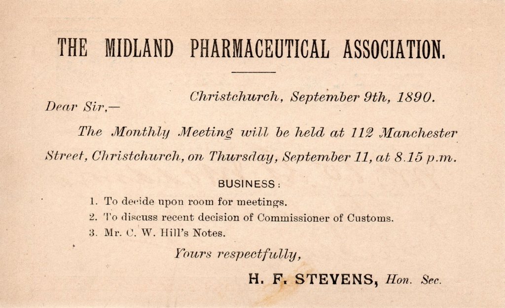 The Midland Pharmacy Association was established to look after the interests of chemists, druggists and pharmacists in the Canterbury region.