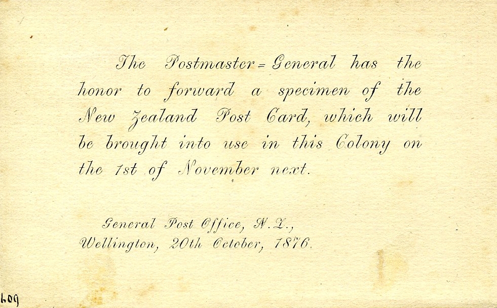 Printed in 1876 by the Post Office, the card was issued to provide examples of New Zealand’s first postal stationery card.