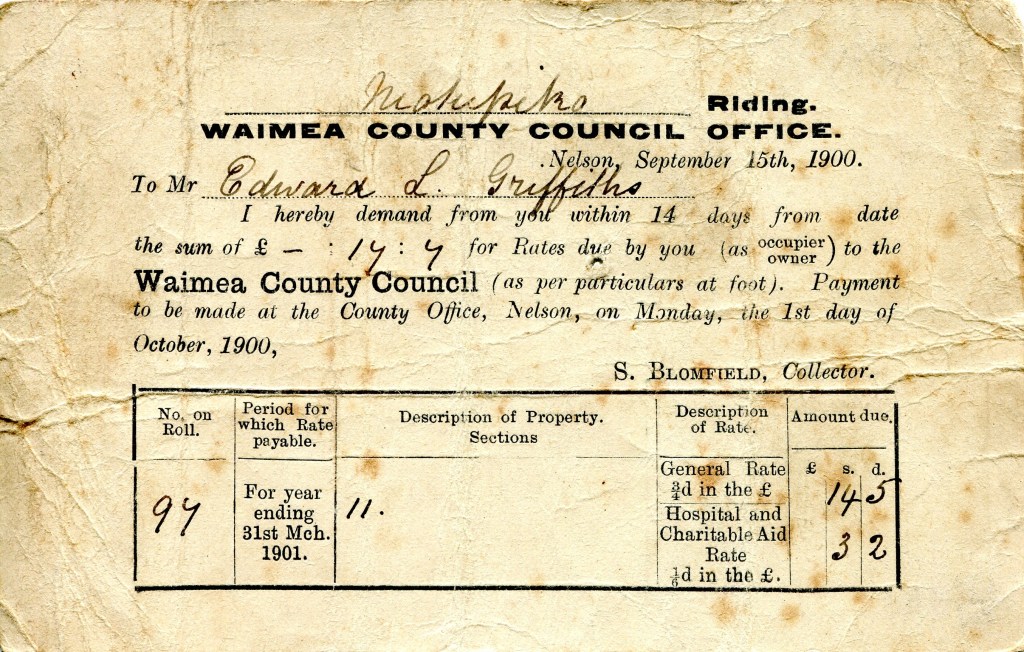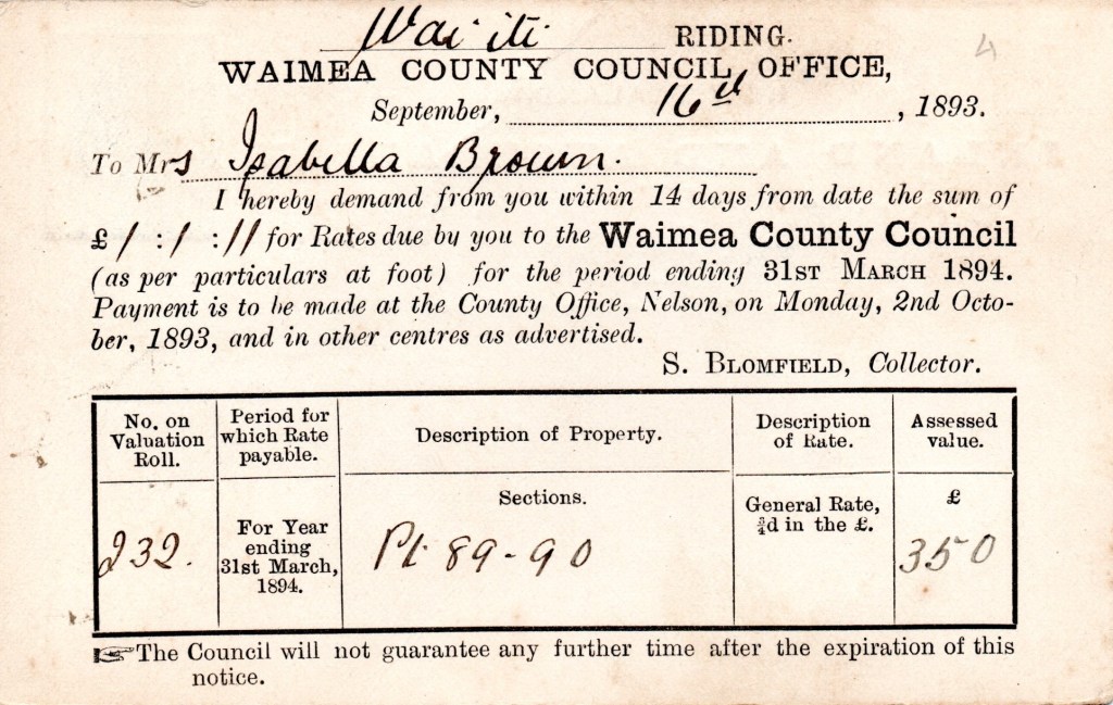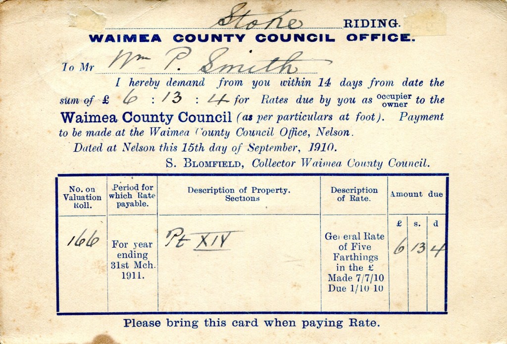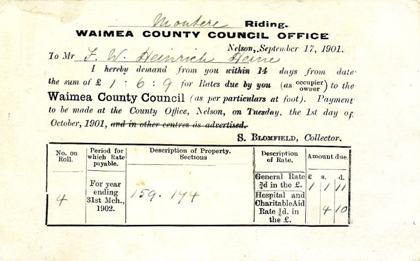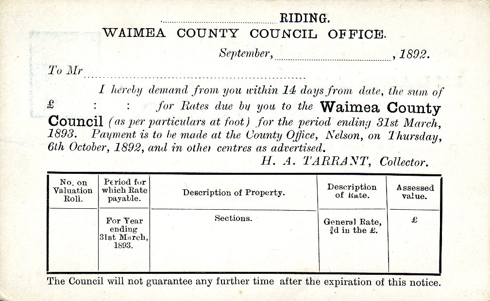 Waimea County Council was established in 1876 and covered the area of the Waimea Plains at the northern end of the South Island, the council offices were located in Nelson. In 1989 The Waimea council area was merged into the new Tasman regional council with its offices at Richmond.