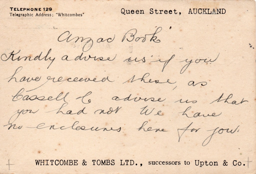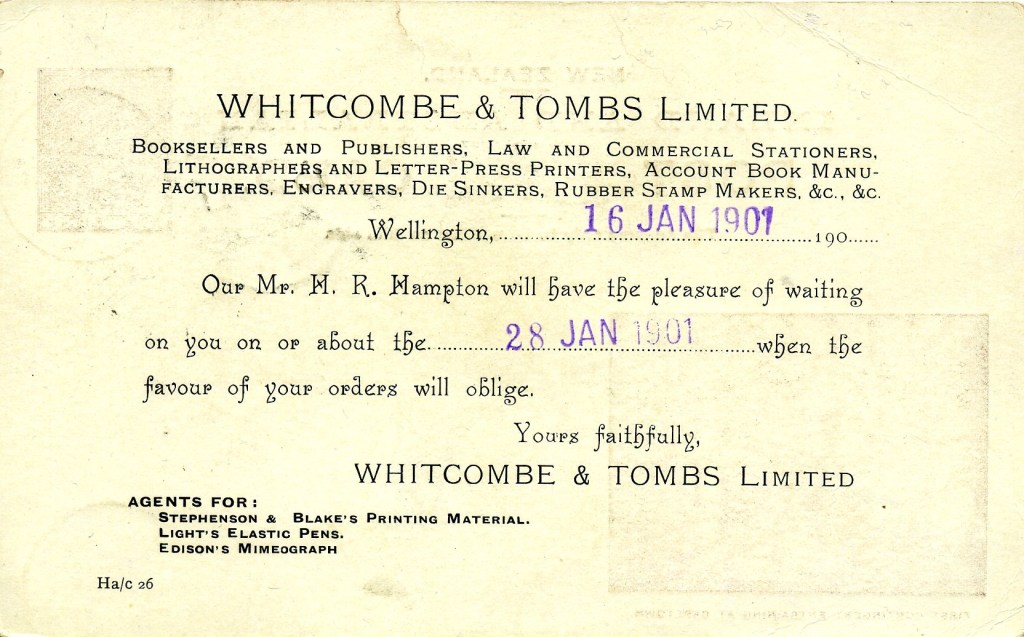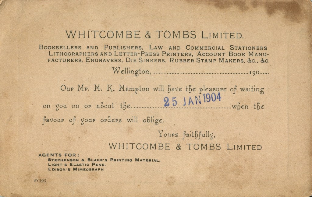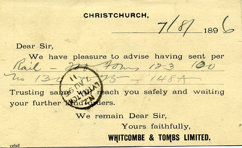 The printer, publisher and booksellers Whitcombe & Tombs Ltd was established on Cashel Street, Christchurch in 1882 by George Hawkes Whitcombe and George Tombs. The company expanded beyond Christchurch and in 1971 merged with the printers Coulls Somerville Wilkie to form the firm Whitcoulls.
