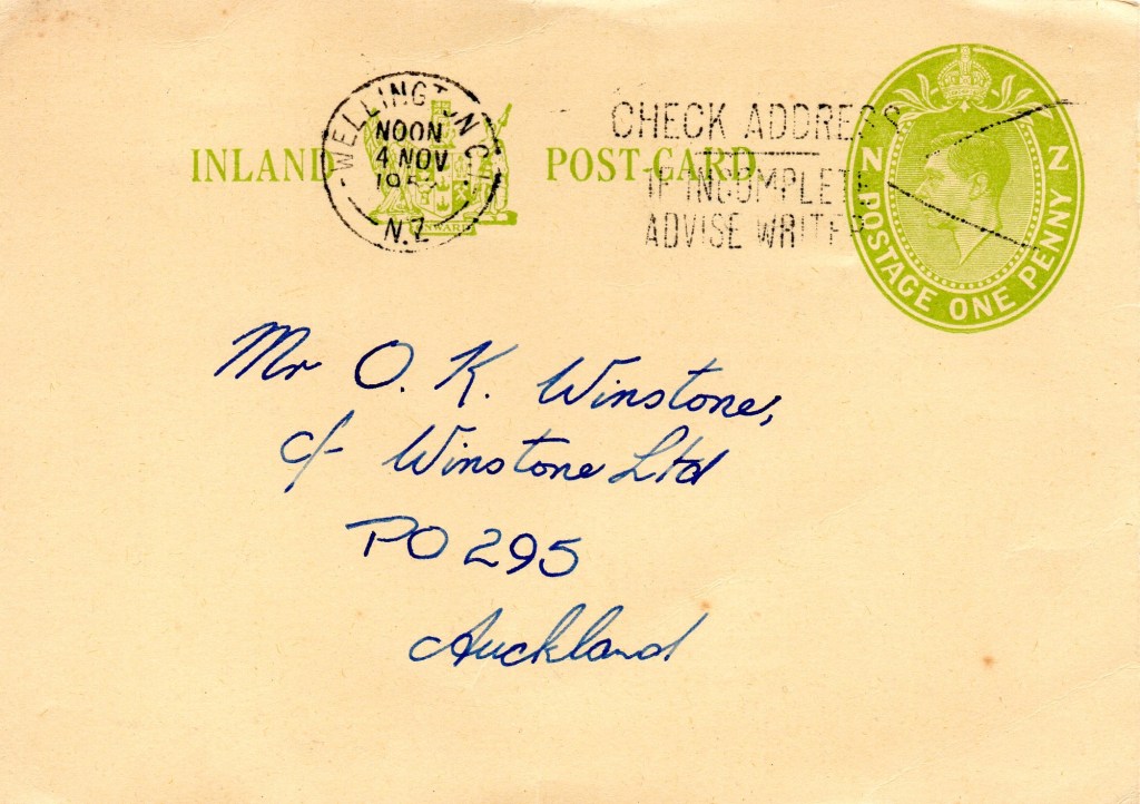 Reference: Barkley, J., 2012 ‘Winstone Ltd Postal Stationery Card’ The New Zealand Stamp Collector, Vol. 92, Number 3, p.65 Samuel, R.D., 2006. The Postage Stamps of New Zealand. Volume IX. PP71